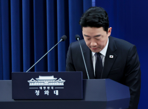 강훈식 비서실장이 15일 청와대 기자회견장에서 전략경제협력 대통령특사 활동 결과 관련 브리핑에 앞서 인사하고 있다. 연합뉴스