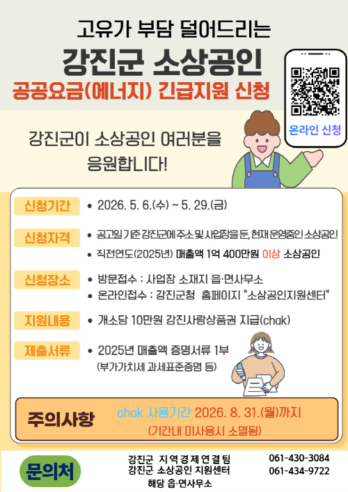 강진군이 중동 전쟁 여파에 따른 에너지 가격 폭등으로 경영난을 겪고 있는 관내 소상공인을 돕기 위해 ‘공공요금(에너지) 긴급 지원사업’을 추진한다.