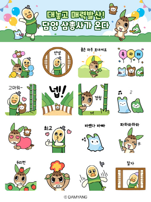 이모티콘 16종은 담양의 대표 관광자원인 대나무와 메타세쿼이아 등을 친근하게 형상화한 캐릭터들이 일상 속 감정을 표현하는 ‘움직이는 이모티콘’ 형태로 제작됐다.