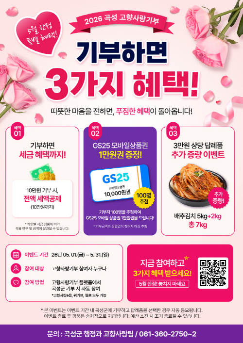 5월 한 달간 인기 답례품을 증량 제공하고, 기간 내 기부자 중 무작위 100명을 추첨해 GS25 1만원권 모바일 상품권을 증정하는 등 다양한 혜택으로 기부 참여를 독려할 예정이다.