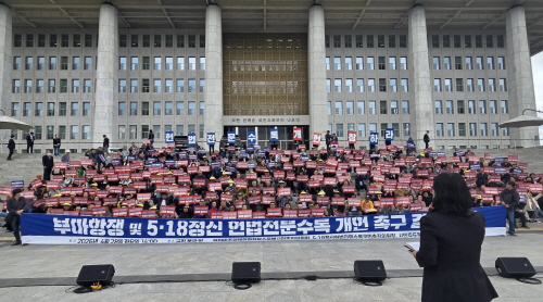 5·18정신헌법전문수록국민추진위원회, 부마민주항쟁헌법전문수록범시민추진위원회, 시민주도헌법개정전국네트워크는 28일 오후 2시 서울 국회 본관 앞 계단에서 ‘부마항쟁 및 5·18정신 헌법전문 수록 개헌촉구 결의대회’를 개최했다. 사진제공=5·18기념재단