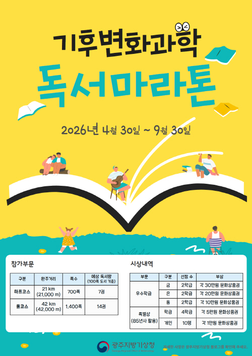 광주지방기상청은 미래 세대의 주역인 초등학생들이 독서를 통해 기후위기를 이해할 수 있도록 9월30일까지 ‘2026 기후변화과학 독서마라톤’을 개최한다